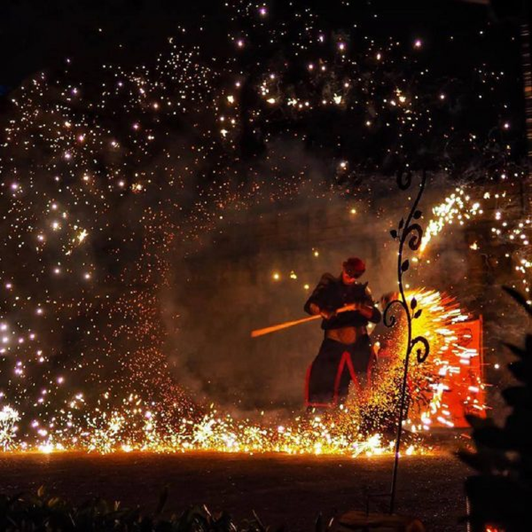 20 à 45 minutes de spectacle pyrotechnique intense, mêlant les effets de feu les plus spectaculaires avec la grâce et la poésie des danseurs et artistes jongleurs dans une histoire poétique qui emmène petits et grands au delà des étoiles, à virevolter avec les nébuleuses et à danser avec les comètes argentées pour assister à la naissance du ciel …